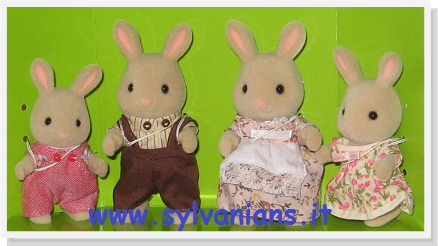 UK: Periwinkle Rabbits (From the left to the right: Boris, Otto, Barry, Carla, Flora - except for Barry, these are the Italian names of Boy, Father, Mother and Girl, that are the same figures as “Flair” Oliver, Alex, Kate, Rebecca - Flair U.K. Baby Boy Jamie, Flair U.K. Baby Girl Hannah, Epoch Italian version Twins, Epoch Italian sitting Baby Boy Robbie, Epoch Italian Baby Girl Saskia) US: Buttermilk Rabbits IT: Conigli Latte ( Milk Rabbits )