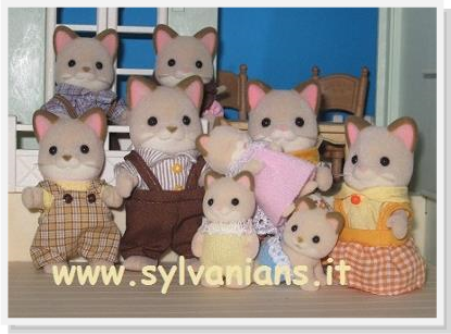 ( Father, Mother, Brother and Sister item no. 3128, 2009 Epoch Original Sylvanian Families Italian catalogue. Italian Edition. ) ( Grandparents: U.K. Flair catalogue. Baby Boy Larkin item no.4141, 2003 U.K. Flair catalogue. Twins item no. 4142, 2006 U.K. Flair catalogue. ) |